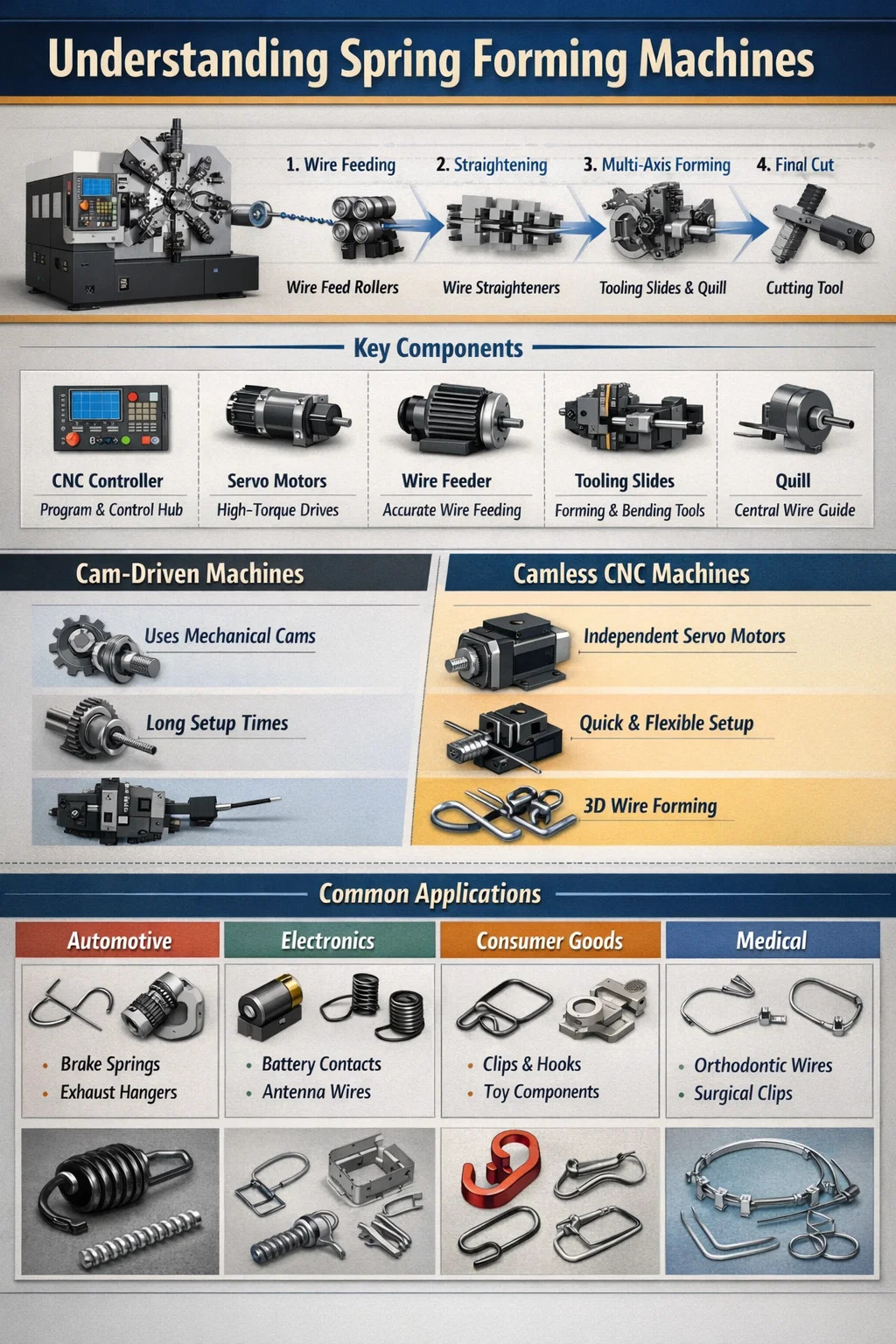 Modern mașini de formare a arcurilor fără came utilizați servomotoare independente pentru fiecare glisament de sculă. Acest lucru permite ajustări instantanee prin intermediul software-ului. Beneficiile cheie includ: