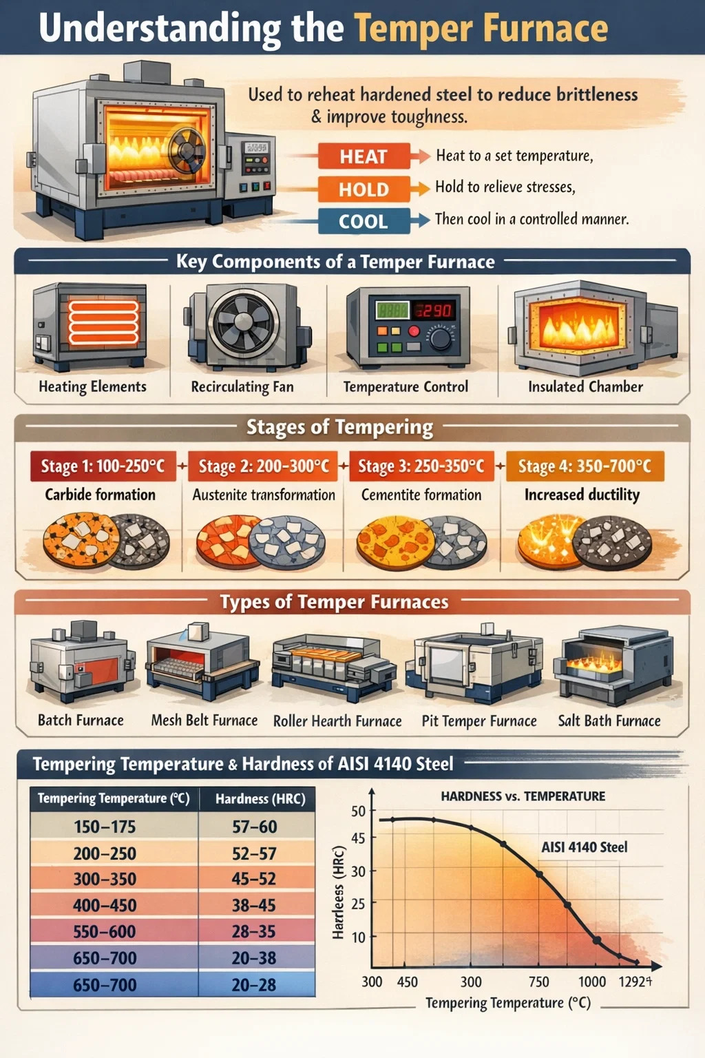 Cuptoarele de temperare sunt utilizate pe scară largă în industria auto, aerospațială, unelte, rulmenți și producție de arc. Ei procesează totul, de la instrumente de tăiere și roți dințate până la componente structurale și instrumente chirurgicale. Intervalul de temperatură de funcționare al unui cuptor tipic de temperare este 150°C până la 700°C (302°F până la 1292°F) , în funcție de material și proprietățile mecanice vizate.