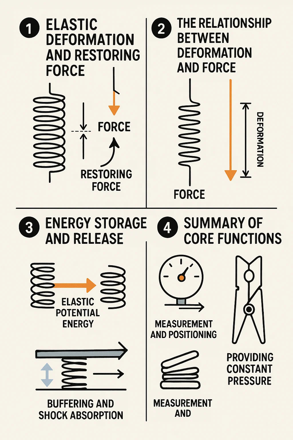 Amortizare și absorbție a șocurilor: Arcurile pot absorbi energia de la impacturi și vibrații și o pot elibera treptat în timp, protejând structura (cum ar fi sistemul de absorbție a șocurilor al unei mașini). Măsurare și poziționare: La cântare, deformarea unui arc poate fi folosită pentru a măsura greutatea; în multe dispozitive mecanice, este folosit pentru a readuce piesele în poziția lor inițială după finalizarea lucrărilor (cum ar fi butoanele și întrerupătoarele).