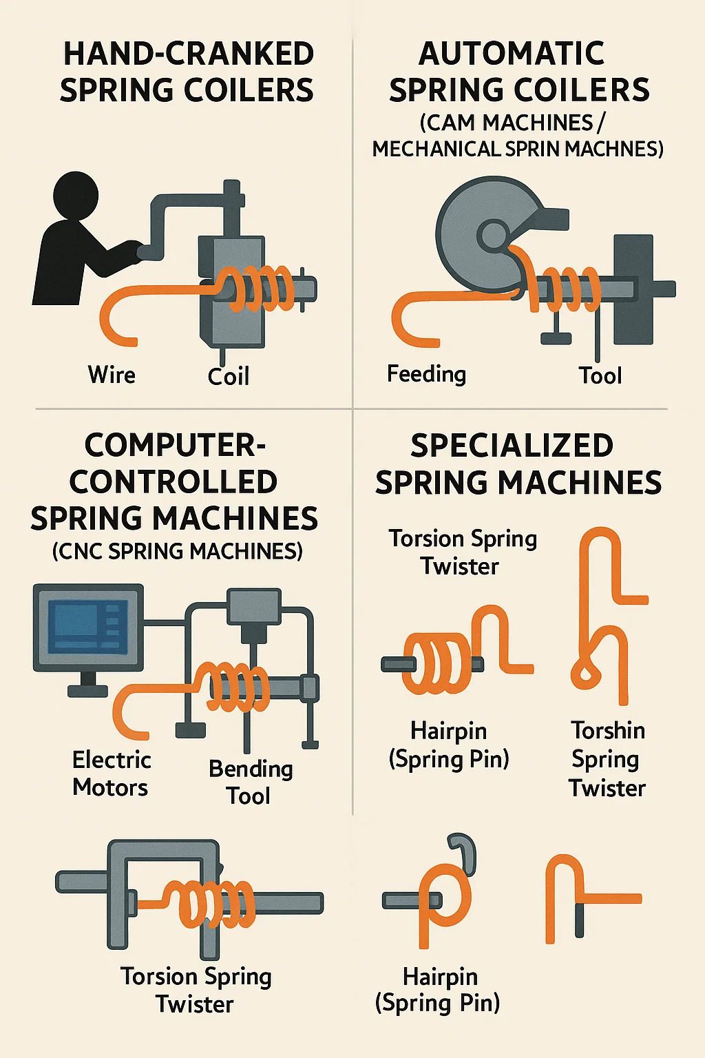 Toate mașinile de fabricare a arcurilor iau o bucată lungă și dreaptă de sârmă metalică și o îndoaie în mod repetat în forma potrivită încolăcită sau în formă, apoi o taie la lungime. Diferența cheie este modul în care controlează acești pași de îndoire.